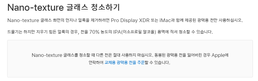인터넷에 떠돌고 있는 글들을 기사로 베껴적기 전에 한 번이라도 검색을 해봤다면, 비록 <호환성>에 있어 이 천이 모든 제품에 사용이 가능하지만, 원래는 애플 디스플레이의 나노-텍스처 글래스를 청소하기 위해 제공되던 제품이라는 것을 알 수 있고, 무려 7,899,000원짜리 모니터의 화면을 청소하기 위해서 애플은 반드시 동봉된 전용 광택용 천을 사용하라고 이야기하고 있으며, 금번에 출시된 제품은 기본 제공되는 제품을 분실하거나 새로운 제품을 구입할 필요가 있을 때를 대비한 것을 알 수 있을 것입니다. (참고 : Apple 디스플레이의 Nano-texture 글래스를 청소하는 방법)