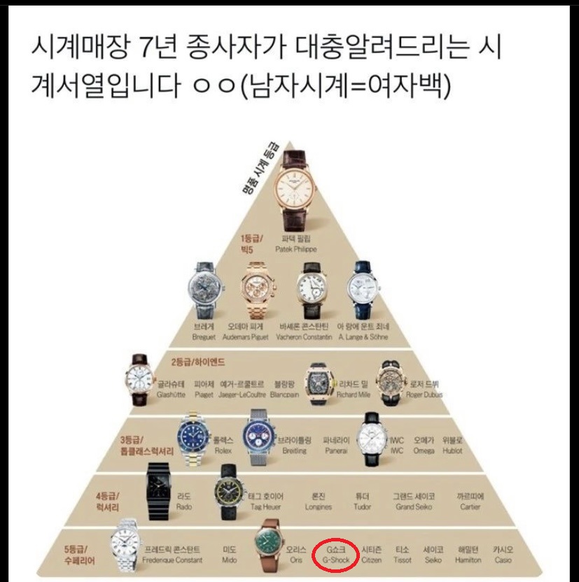 이재명이 당선되었다면 또 다른 핑계로 뭔가를 질렀겠지만, 윤석열 당선 기념으로 머드마스터 GG-B100을 지른 이유는 향후 5년 동안 이런저런 <충격>에도 견디고 <진흙탕>을 굴러도 끄떡없이 살아남아야겠다는 의지의 표명이 아니겠습니까? (<오렌지> 색은 정말 그냥 예뻐서 고른 거지 <오렌지 혁명>을 연상시키거나 할 생각은 없었습니다.) 아울러 저희 매니저 중 하나가 보내준 시계 계급도를 보면서 저 같은 하층민은 계급에 맞게 지샥이 어울린다는 생각을 한 것도 이유 중 하나기도 합니다.