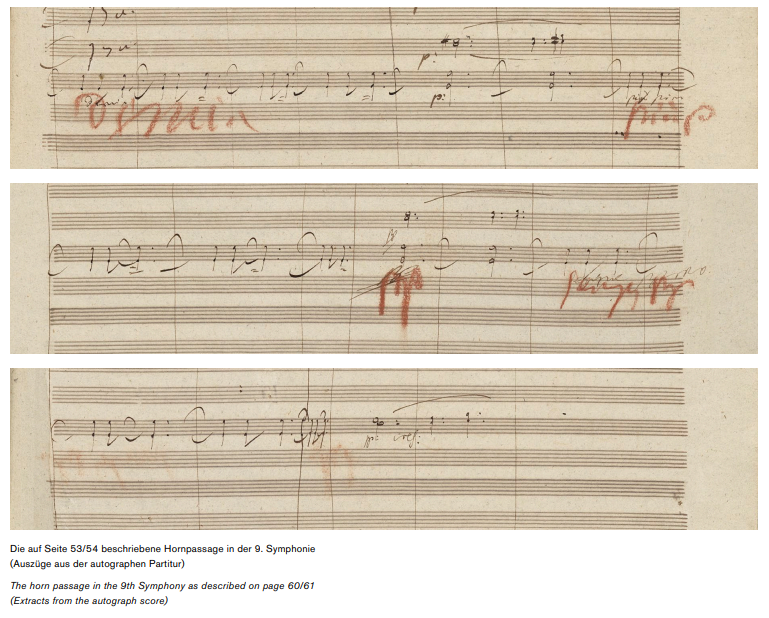 이렇게 수십 년 동안 지휘자들을 걱정시켰던 몇몇 문제들을 해결하기 위한 여정이 시작되었습니다. 일부 해독은 자필악보를 통해 결정될 수 있는데, 예를 들어 제9번의 1악장 재현부로 이끄는 지속적인 [그림 1]과 같은 리듬의 트럼펫과 드럼의 타격과 같은 경우입니다. (인쇄보에는 [그림 2]와 같은 음형이 표기되어 있습니다) 자필악보를 해독함으로써 이것이 베토벤에 의한 수정이 아닌 필사자의 오독에 의한 것이라는 것을 확정할 수 있었습니다. 원전 자료에 있어 일부 – 베토벤이 일정 부분 권한을 가지고 있는 자필원고나 초판 등 – 는 판독에 있어 모호함이 없지만, 명확한 일관성을 도모하려는 선한 의도를 가진 편집자에 의해 나중에 수정된 경우에는 베토벤의 의도라 할 수 없습니다. 이런 경우가 제9번 첫 악장의 (111과 378마디의) 첼로 파트의 몇몇 음표인데, 1990년 사이먼 래틀 경과 논의한 적이 있습니다. 그는 단지 무엇인 정확인 것인지 아는데 만족하지 않고, 베토벤이 일관되지 않았던 이유에 대해 알아야 한다고 주장했습니다. 다행히 이 경우는 설명하기 어렵지는 않은데, 이전 마디로 부터 기대되는 음표가 멜로디에 대해서 병행 2도를 유발하는 문제를 작곡자가 두 가지 방법으로 해결한 것입니다.