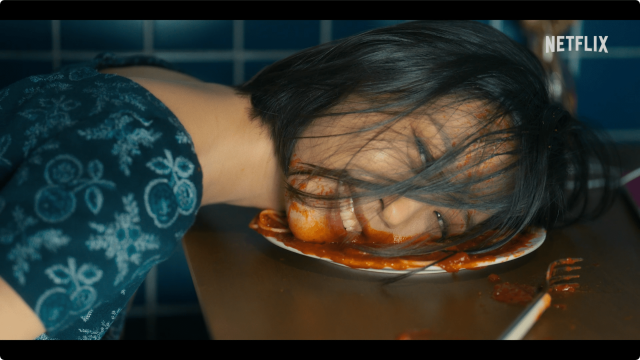 유성아의 요리는 시종일관 토마토입니다. 펜션에 토마토를 키워보고 싶다고 말하며 자신은 토마토 요리를 잘 한다고 이야기하죠. 아이에게 특별식으로 주었던 것도 토마토 소스 스파게티고, 전영하와의 만찬에서도 늘 토마토 요리입니다. 음료조차도 토마토 주스예요. 붉고 걸쭉한 액체의 이미지는 그녀의 피에 대한 욕망을 표현한다고 보입니다. 영화 <케빈에 관하여> 도입부의 토마토 축제에 사용한 이미지도 유사한 이유겠지요.