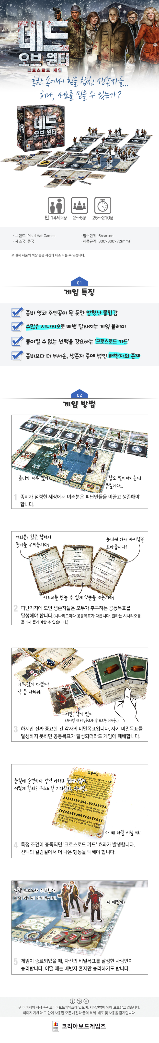 한때 마이너 한 B급 장르로 여겨지던 좀비 이야기는 이제 국내에서도 <부산행>, <킹덤> 같은 작품 덕에 제법 친숙한 장르가 되었습니다. 그렇기에 좀비 아포칼립스를 배경으로 하는 보드게임 <데드 오브 윈터 : 크로스로드 게임>도 그 장르의 특수성에도 불구하고 누구나 즐길 수 있는 게임이 되었다고 할 수 있겠습니다. 이 게임의 배경이 좀비 아포칼립스의 겨울이기에 날이 차가워진 요즈음 시작하기 좋은 게임이라 할 수 있습니다.
