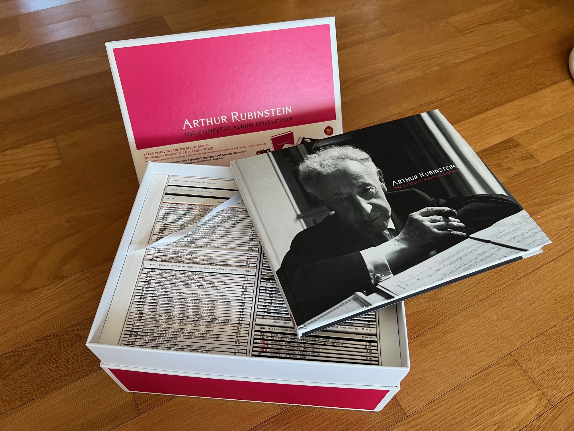 요즘의 박스들은 장당 가격 차원에서 엄청나게 저렴해진 탓에 그 패키징이 오리지널 커버를 쓴다는 것을 제외하면 아쉬움이 많은 편인데, 이런 박스 세트 초창기에는 그럭저럭 괜찮은 구성의 박스들이 있었습니다. 그중 가격이나 패키징이나 나름 염가버전이지만 결코 염가는 아니었던 박스가 루빈스타인 전집이었습니다. 원래 RCA에서는 자사에서 남긴 음반들을 모아 1999년 94장짜리 호화 박스 세트로 낸 적이 있는데, 당시 제가 가장 가지고 싶었던 박스 세트였지만, 당시 200만 원이 넘는 가격을 감당할 수는 없어 낱장으로 모으기만 했었습니다. 그러다 2011년 RCA 뿐 아니고 그가 남긴 모든 음반을 모아 오리지널 커버를 적용한 142장 + 2 DVD의 진정한 전집이 나옵니다. 구성은 사진에 보이는 것처럼 단단한 박스에 제법 두터운 슬리브를 이용한 LP 미니어처 형식에 커피테이블 스타일의 책자를 제공하고 있습니다.