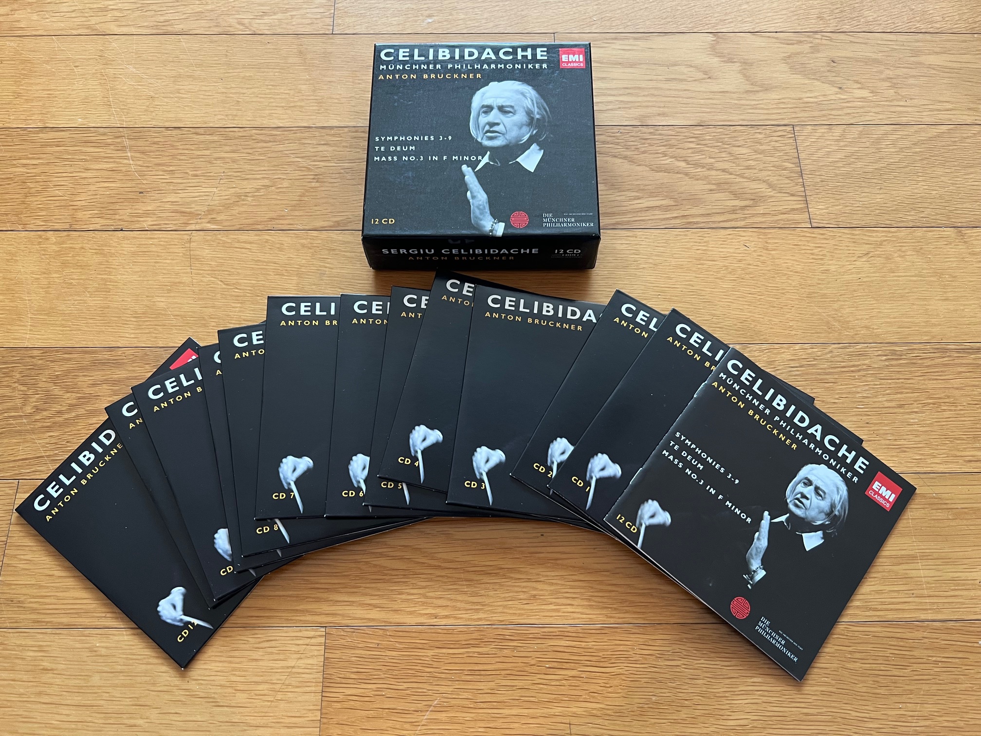 베를리너 필하모니커의 지휘자에서 카라얀에 밀려 나가고, 일부에서 상업주의에 찌든 카라얀의 악마화 분위기와 함께 이 사건에 대한 거짓 전설이 형성되고, 녹음을 극히 싫어하는 성향 덕분에 첼리비다케는 생전에도 그야말로 살아있는 전설의 위치를 지니고 있었습니다. 하지만 구할 수 있는 음반이란 것은 사실상 불법 음반들이어서 다들 음반으로는 그 진가를 알 수 없고 실연을 통해서만 그 진가를 알 수 있다고 <카더라> 전설만 회자되곤 했습니다. 그러다 그의 사후에 가족의 결단(?)으로 1998년 EMI에서 첼리비다케의 녹음들을 <First Authorized Edition>이란 이름으로 발매하게 됩니다. 이 에디션은 10장 남짓의 박스들로 나누어 발매되었지만, 당시 박스 세트가 그렇듯 동일한 음반을 낱장으로도 구할 수 있어서 많은 사람들이 취향 것 첼리비다케의 전설의 실제를 체험할 수 있었습니다. 이때 브루크너의 곡들은 교향곡 3~9번을 중심으로 12장짜리 박스로 나뉘어 발매되었고, 역시 낱장으로도 구할 수 있었습니다.