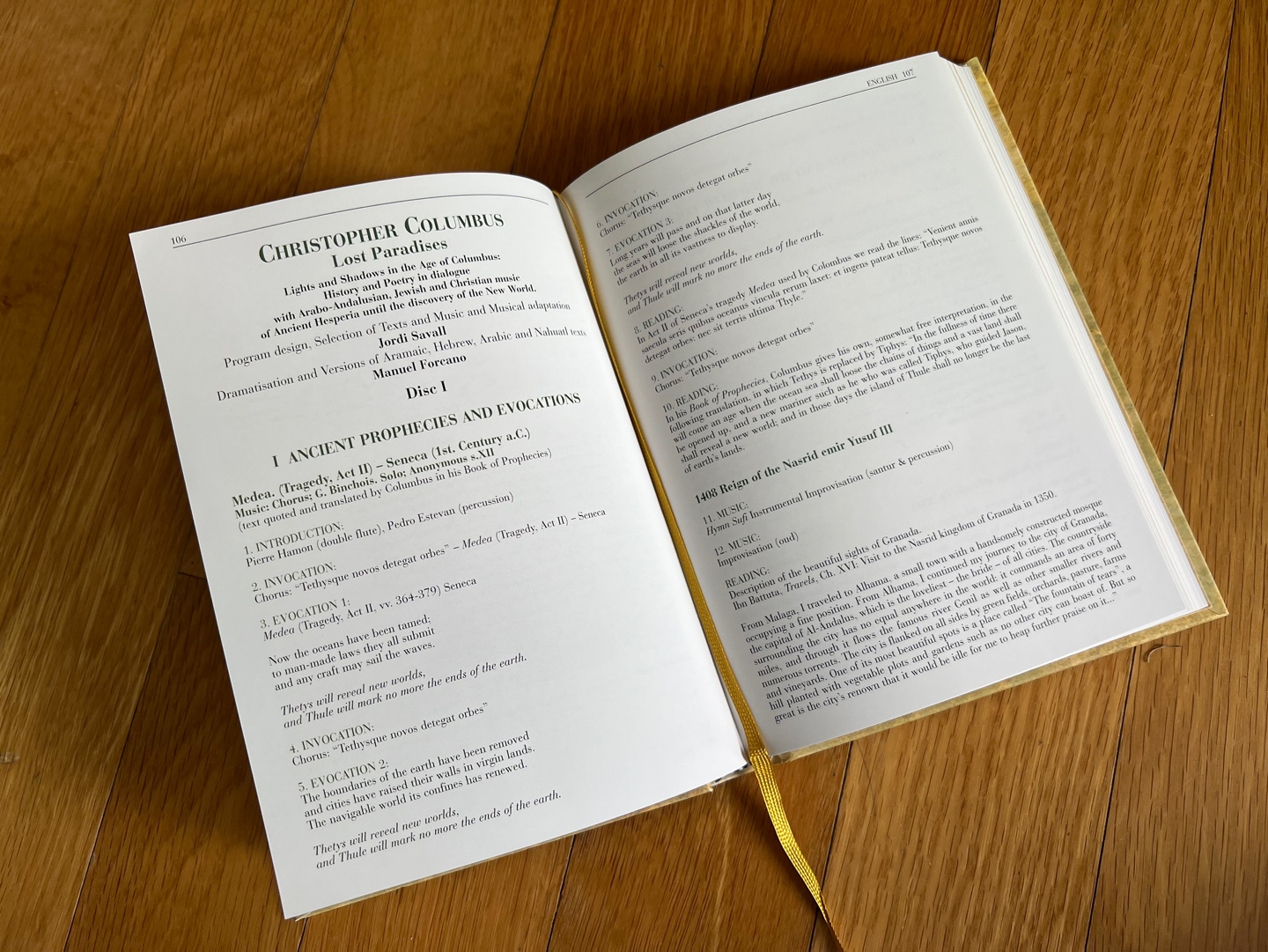 음반의 구성은 이미 소개했던 사발의 음반들(이사벨 1세 / 카를 5세) 처럼 콜럼버스의 기원과 생애를 따라가며 적절한 음악을 배치하고 있습니다만, 이번 음반은 더 나아가 음악의 나열을 넘어 일종의 오디오 드라마를 만들어 내고 있습니다. 그래서 단순히 음악만을 담은 것이 아니라 콜럼버스나 동시대 사람들의 글을 인용하고 음악을 배경으로 낭독하는 트랙들이 삽입되어 있습니다. 그리고 그 시작은 콜럼버스가 자신의 책자에 인용해 놓은 세네카의 <메데이아>의 구절 "Tethysque novos detegat orbes"(테티스가 새로운 세상을 발견할 것이다)을 통해 신대륙의 발견에 대한 고대의 예언에서 시작해 이슬람 왕국과 그 몰락, 콜럼버스의 탄생, 과학적 발견들, 알폰소 5세의 나폴리왕 등극, 이사벨과 페르난도의 그라나다 정복으로 이어지며 유대인들과 무슬림의 추방 등 신대륙 발견 이전의 배경을 음악과 내레이션으로 들려줍니다. 그리고 콜럼버스의 아메리카 발견 이후에는 원주민의 음악, 그리고 이사벨 1세의 죽음, 콜럼버스의 죽음까지 그 음악적 드라마가 이어지는데, 음반 요소요소에 각각의 사건과 연관되는 문건에 대한 낭독, 그 관련된 민족의 음악들과 사건과 연관된 음악이 삽입됩니다.