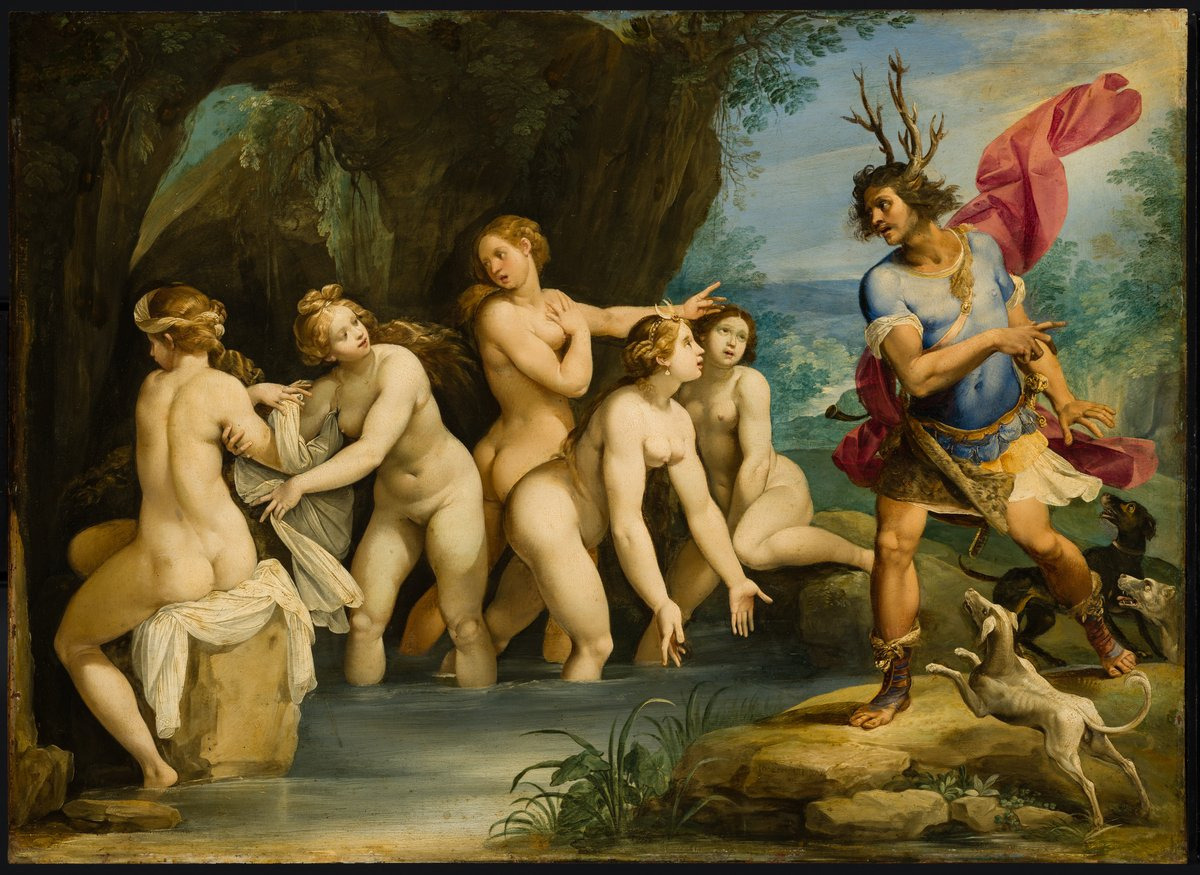 악타이온의 갑작스러운 등장은 디아나 여신과 함께 있던 님프들을 놀라게 하는데, 체사리는 다섯 여신의 동작을 각각 다르게 표현하면서도 그 동작을 과장되게 묘사하고 있습니다. 이 과장된 동작은 이들이 진짜로 놀란다기보다는 뭔가 놀람을 가장하고 있다는 의심이 들게 해 줍니다. 유혹하는 듯한 자세로 관객에게 등을 보이며 돌아선 맨 왼쪽의 님프 곁에서 그녀를 부축하는 듯한 포즈를 취한 두 번째 님프의 모습을 보면 이 점이 더 명확해지는데, 그녀는 오히려 악타이온 쪽으로 몸을 돌려 고혹적인 눈길로 악타이온을 바라보고 있습니다. 그리고 이 시선은 악타이온의 시선과 마주칩니다. 아울러 왼쪽에서 세 번째 님프는 비록 고개는 돌리고 있지만 손의 자세는 악타이온과 일치하고, 막상 상체는 살짝 악타이온 쪽으로 틀어서 나신을 그쪽으로 향하게 함으로써 유혹하는 듯합니다. 맨 오른쪽의 님프 역시 이 상황을 피하기보다는 상체를 악타이온 쪽으로 틀어 악타이온을 바라보며 그의 시선을 갈구하는 듯한 표정을 짓습니다. 물을 끼얹는 디아나 역시 시선을 피하기보다는 오히려 악타이온을 바라보며 여섯 명 중, 가장 노출이 심한 자세로 악타이온을 정면으로 바라봅니다. 그리고 이들의 성숙하고 여성적인 육체와는 상반된 앳된 소녀 같은 얼굴은 관객에게 묘한 에로스적 감정을 불러일으킵니다. 사냥개들 마저 위협적이라기보다는 이 순간을 즐기며 깡총거리며 주인의 시선을 갈구하는 것 같습니다. 사슴뿔이 머리에서 돋아난 악타이온의 자세와 표정은 저주를 받아 고통에 찬 모습이라기보다는 오히려 디아나와 님프들의 마음과 육체를 정복한 정복자로 보이며, 사슴뿔은 이 정복을 상징하는 왕관으로 보입니다. 더구나 악타이온은 파란색 상의에 붉은 망토를 입어 고귀한 존재로서의 상징성을 드러냅니다.