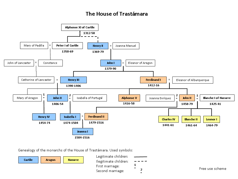 이사벨 1세를 다룬 이전 글에서 1350년 지브롤터의 무슬림을 포위하고 있던 카스티야의 왕 알폰소 11세가 흑사병으로 사망함에 따라 적자인 페드로와 사생아지만 아버지의 사랑을 받아 후임으로 유망 시 되던 트라스타마라의 엔리케 사이에 오랜 내전에서 엔리케가 승리함으로써 카스티야에 트라스타마라 왕조(엔리케 2세)가 성립되게 되었고, 1410년 아라곤의 마르틴 1세가 후계자 없이 죽은 뒤, 선출위원회는 엔리케 2세의 손자이자, 카스티야의 왕인 엔리케 3세와 형제지간인 페르난도를 왕으로 선출(페르난도 1세)하게 되어, 트라스타마라의 혈통이 카스티아와 아라곤의 왕가에 양쪽에 흐르게 되었다고 이야기한 바 있습니다. 알폰소 5세는 이 페르난도 1세의 아들로 아라곤의 왕위를 물려받게 됩니다. 이후 알폰소 5세가 아라곤 왕국은 동생 후안 2세에게, 나폴리는 서자에게 물려주게 되는데, 아라곤을 물려받은 후안 2세로부터 이사벨 1세와 결혼하게 되는 페르난도 2세가 태어나 아라곤의 왕위를 이어받게 되고, 이 결혼으로 인해 통합의 단초가 마련된 카스티야-아라곤 왕권은 훗날 1차적으로는 두 부부의 딸인 후아나 1세에 카스티야 왕권이 세습되고, 페르난도 2세의 사후에는 결국 후아나 1세와 막시밀리안 1세의 아들 미남공 필리프와의 결혼으로 태어난 아들인 카를 5세에 의해 두 왕국의 왕권이 통합되어 합스부르크 왕조가 스페인에 성립된 과정은 카를로스/카를 5세에 대한 글에서 다룬 바 있습니다.